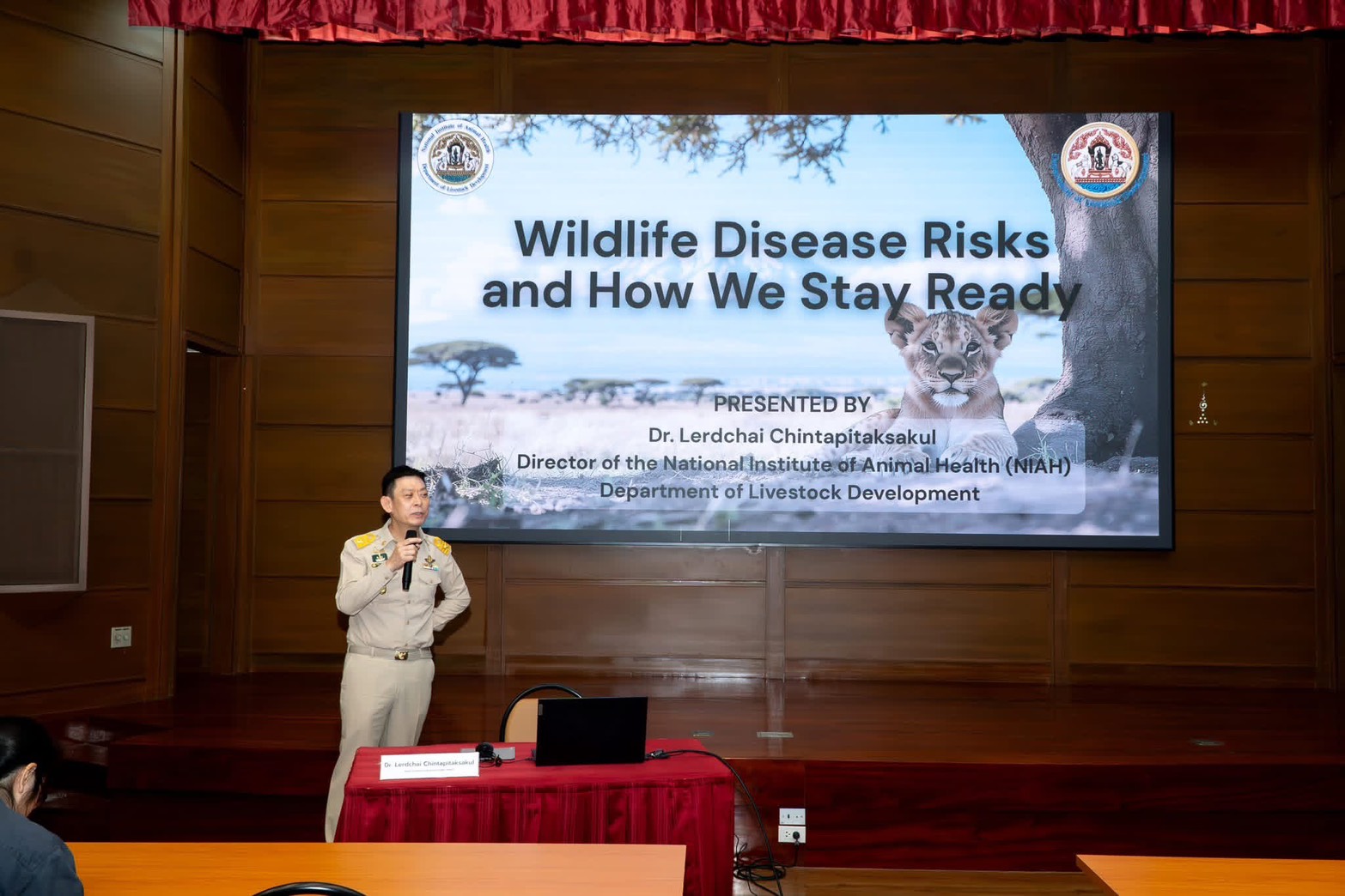 “การพัฒนาเทคนิคการวินิจฉัยโรคในสัตว์ป่า”ณ ห้องประชุมใหญ่และห้องปฏิบัติการ สถาบันสุขภาพสัตว์แห่งชาติ โดยได้รับการสนับสนุนจากโครงการ FAO-DTRA project on Strengthening Animal Health Systems for Biological Threat Reduction in Southeast Asia มีเนื้อหาการฝึกอบรมครอบคลุมตั้งแต่การเก็บตัวอย่างจากสัตว์ป่า สิ่งแวดล้อม การสังเกตอาการและรอยโรค การผ่าซาก การตรวจวินิจฉัยในห้องปฏิบัติการ และการประยุกต์ใช้เทคโนโลยีระดับโมเลกุลสมัยใหม่เพื่อการทดสอบเชื้อโรคสัตว์ป่าและคัดเลือกพ่อแม่พันธุ์เพื่อป้องกันโรคทางพันธุกรรม หลักความปลอดภัยทางชีวภาพและการรักษาความปลอดภัยทางชีวภาพ เพื่อให้ผู้เข้าร่วมได้รับความรู้เชิงลึกทั้งด้านหลักการและการปฏิบัติจริง ผ่านการบรรยาย การฝึกปฏิบัติในห้องปฏิบัติการ และการอภิปรายเชิงโต้ตอบ เพื่อเพิ่มประสิทธิภาพการปฏิบัติภารกิจด้านการเฝ้าระวังและควบคุมโรคอุบัติใหม่ โรคติดต่อระหว่างสัตว์และคนที่เกี่ยวข้องกับสัตว์ป่า ภายใต้แนวคิดสุขภาพหนึ่งเดียว (One Health) เพื่อการบูรณาการที่รวมสุขภาพคน สัตว์ และสิ่งแวดล้อม เข้าด้วยกันเพื่อสร้างความมั่นคงทางสุขภาพที่ดีที่สุดอย่างยั่งยืน โดยได้รับเกียรติจากวิทยากรผู้เชี่ยวชาญจาก กรมควบคุมโรค กระทรวงสาธารณสุข คณะแพทยศาสตร์ ศิริราชพยาบาล มหาวิทยาลัยมหิดล กรมอุทยานแห่งชาติ สัตว์ป่า และพันธุ์พืช องค์การสวนสัตว์แห่งประเทศไทย ในพระบรมราชูปถัมภ์ คณะสัตวแพทยศาสตร์ จุฬาลงกรณ์มหาวิทยาลัย และคณะสัตวแพทยศาสตร์ มหาวิทยาลัยมหิดล